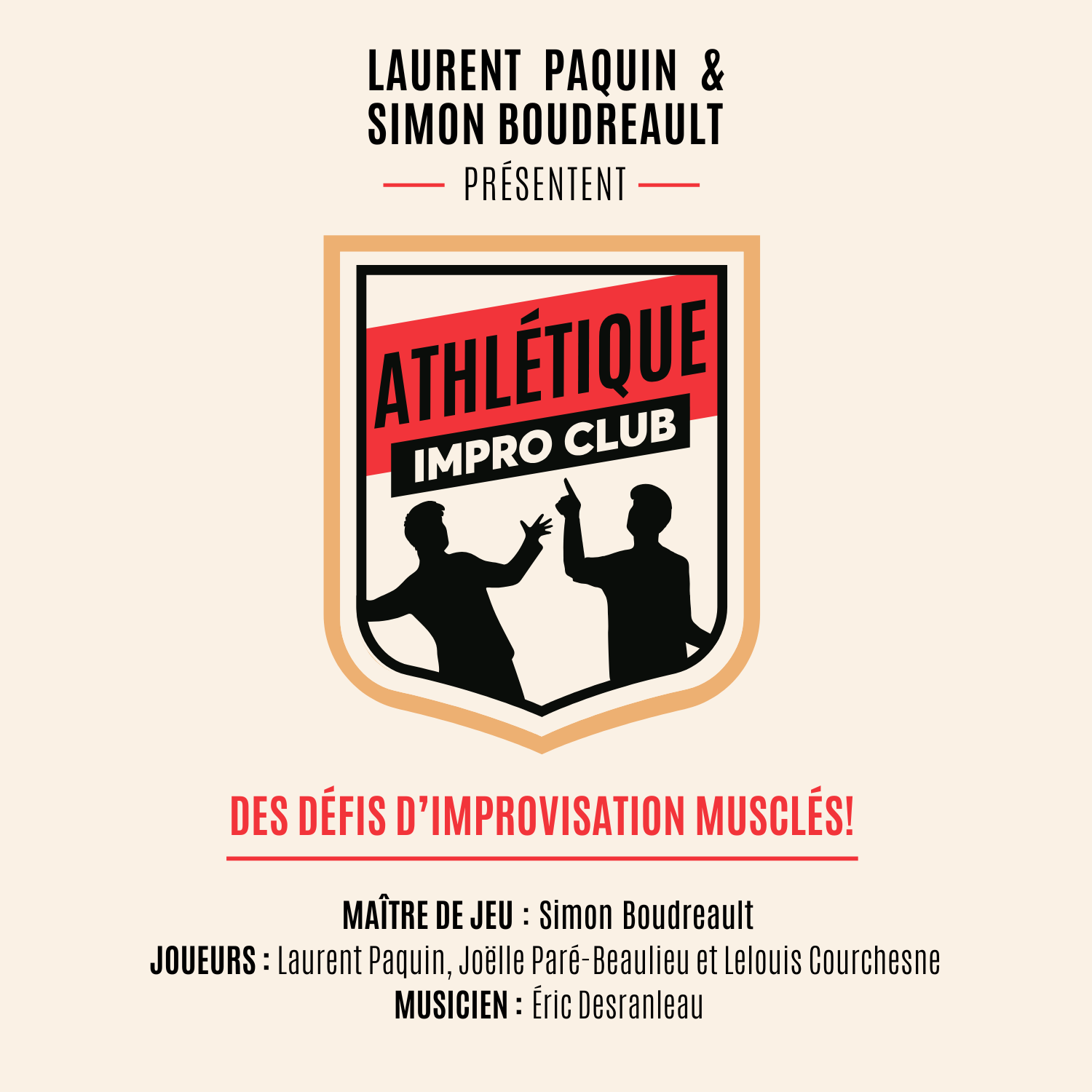 L’Athlétique Impro Club c’est 3 improvisateurs.trice et 1 musicien.ne qui plongent dans le vide sous les contraintes, envies, délires d’un maître de cérémonie qui les amènent dans leur limite. Un show d’improvisation performance athlétique!